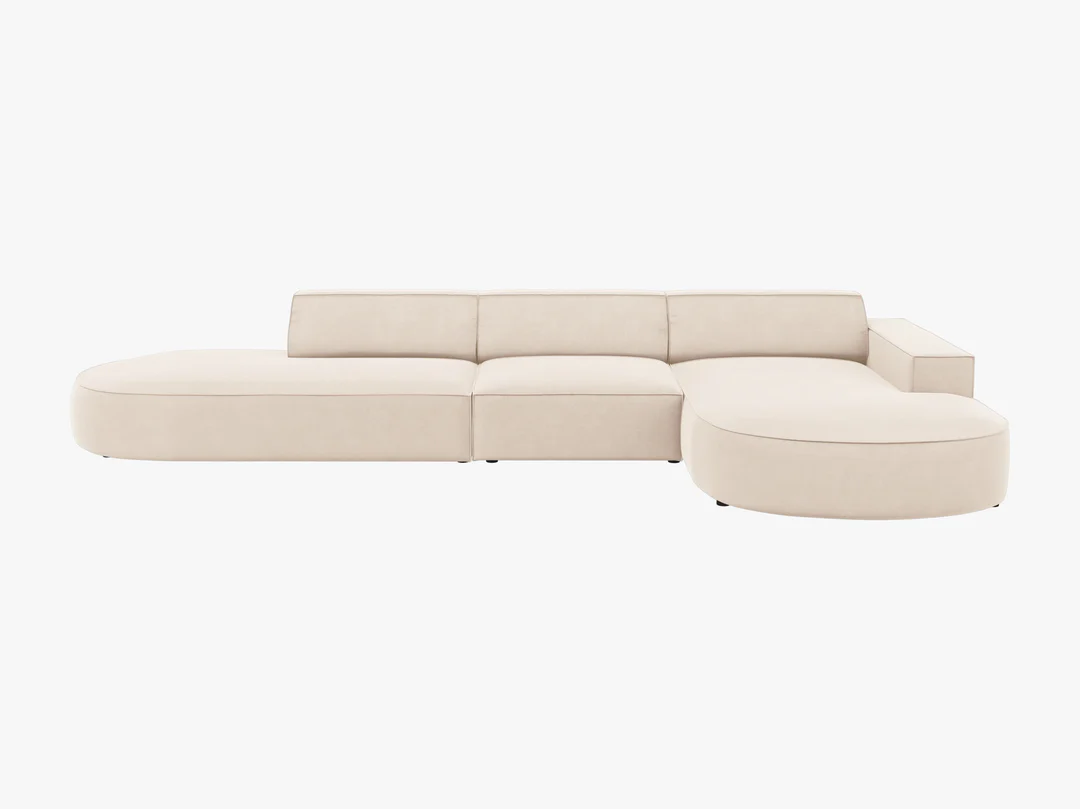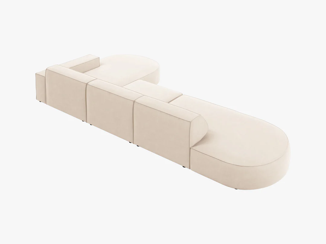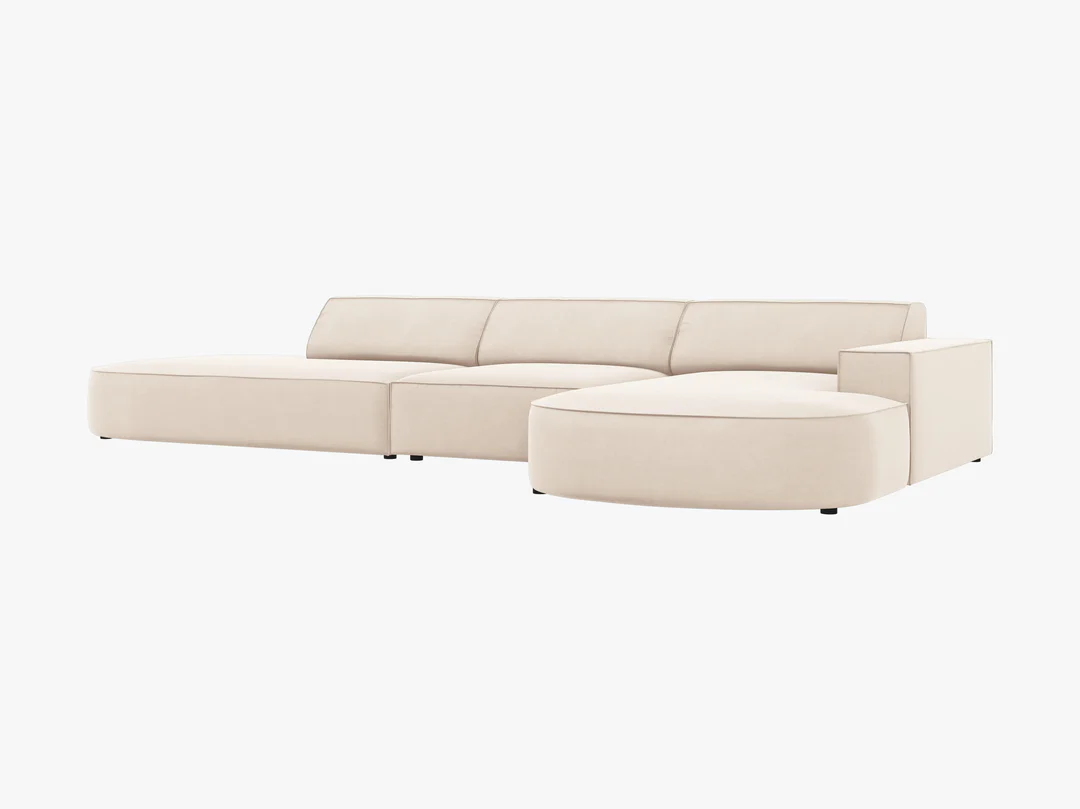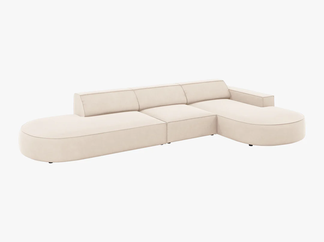 Narożnik Kora z zaokrąglonym szezlongiem – welurowy narożnik 4-osobowy
